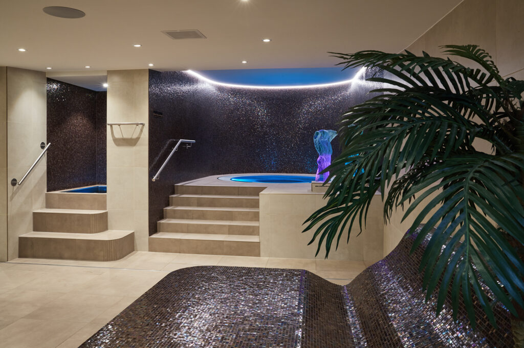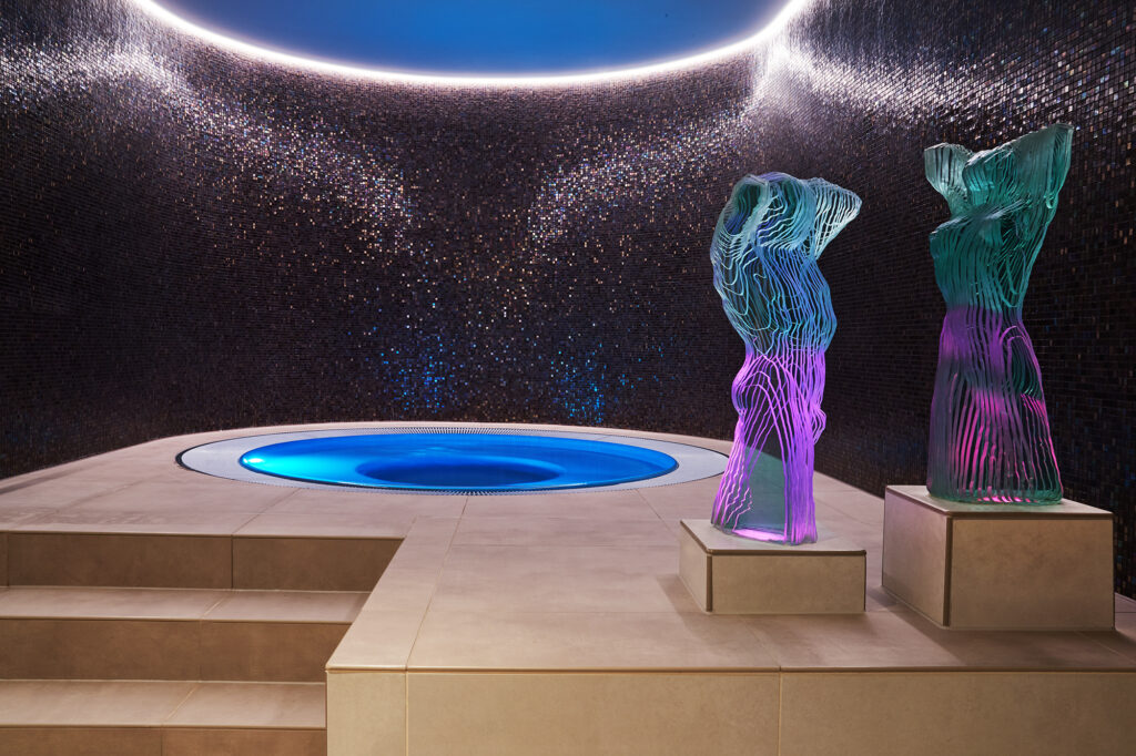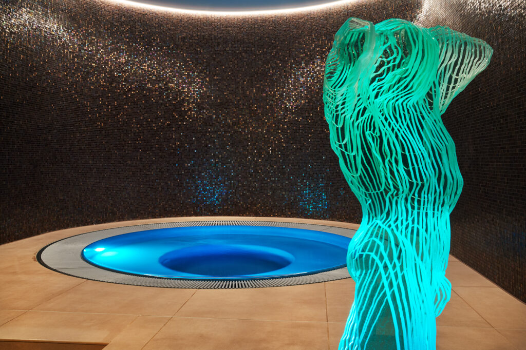 Das prämierte Objekt ist mehr als nur ein Whirlpool – es ist eine architektonisch durchdachte und ausgezeichnet ausgeführte Wellness-Oase. Das Zusammenspiel aus dem tiefem Schwarz der Mosaikwände, dem sanftem Licht und der halbrunden Raum Form schafft eine Atmosphäre, die sowohl modern als auch zeitlos wirkt. Die Unterwasserbeleuchtung verleiht dem Becken eine geheimnisvolle Tiefe rund sorgt für ein spektakuläres Farbspiel.